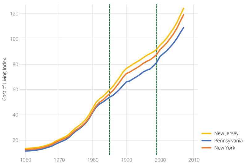 Figure 3 shows the evolution of state cost of living from 1960 to 2007 for New Jersey and its larger neighbors.