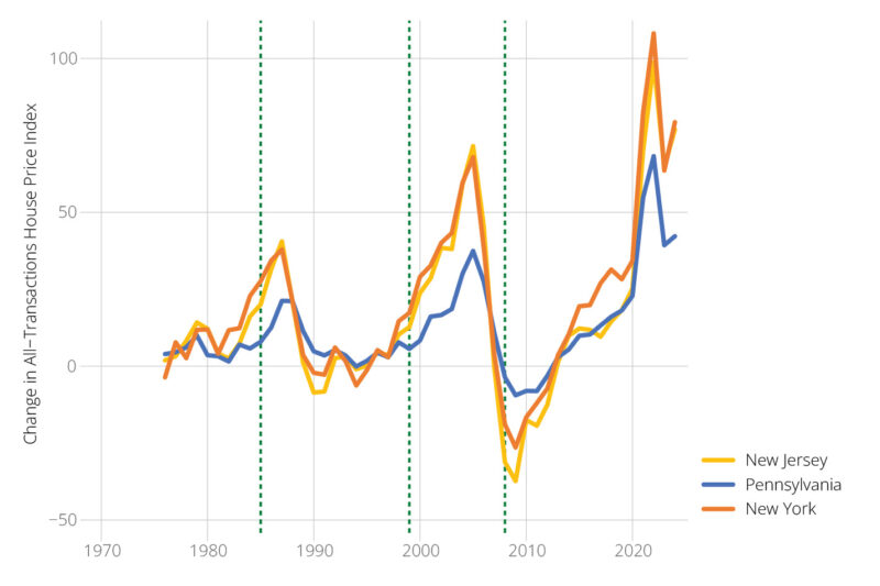 The results here are similar to those in Figure 1, except that Pennsylvania and New York switch places. Pennsylvania produces more housing than New York, but New York produces more multifamily housing than Pennsylvania, which is not surprising since New York is more urbanized. After 1990, New Jersey’s permitting of larger multifamily buildings closely tracks New York’s, but New Jersey did have a slightly higher rate between 2016 and 2022.