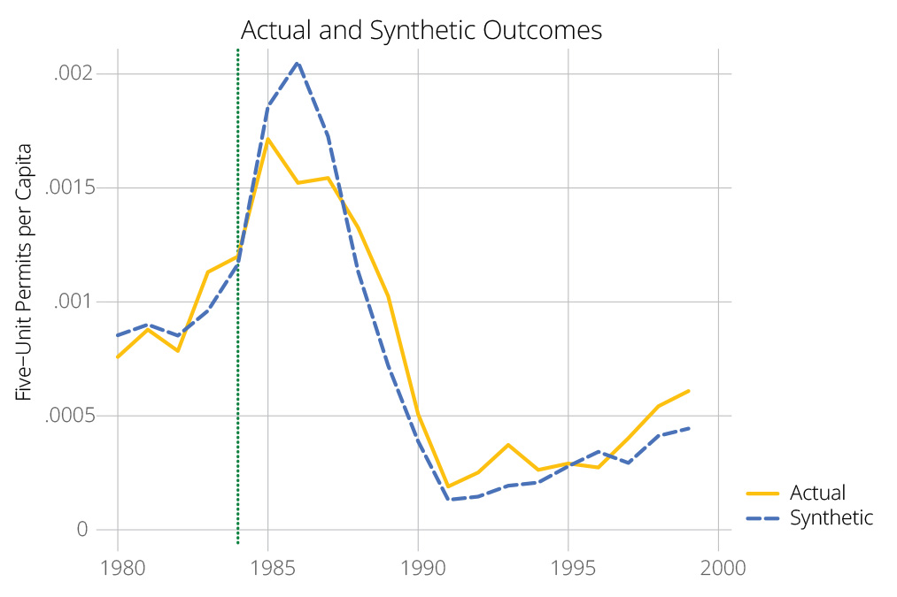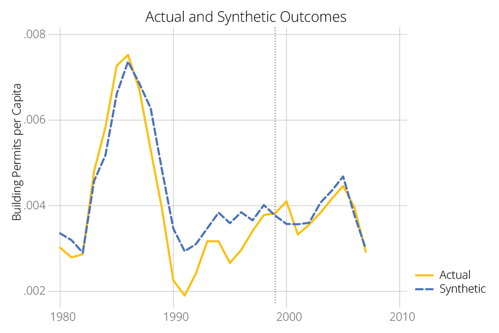 Figure 5 shows the results of the synthetic control analyses of total building permits per capita for the two treatment periods.