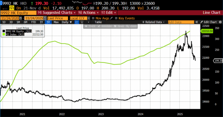 Pop Mart stock price (9992 Hong Kong) and US Money Supply M2, 2000 – present