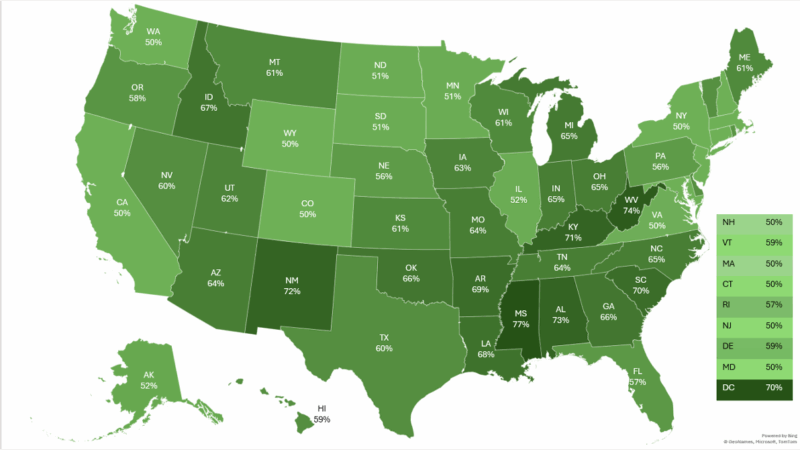 Looking ahead to FY 2026 (October 1, 2025 – September 30, 2026), the federal matching rates for state funds are expected to range from 50 percent (the mandatory minimum matching rate) to nearly 77 percent.[5] Figure 1 shows the federal Medicaid FMAP matching rate for each state.